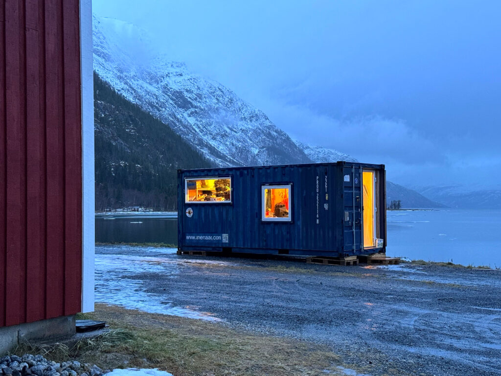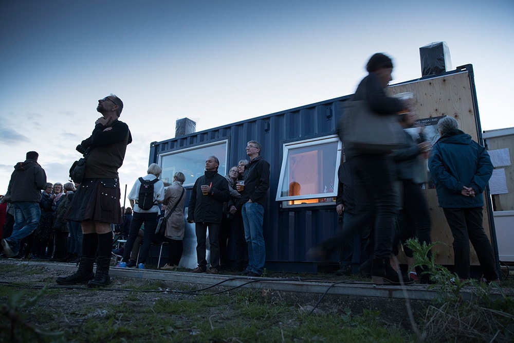 The blue 20-ft. container, certified for sea transport, was designed and set up as a mobile studio for the multimedia installation Anersaaq. The rear section of the container serves as storage for the analog equipment. This also functions as the projection space for the artist Karen Thastum during shows. The front section serves as a reception area for visitors. Since 2016, the art container has traveled across the seas between Norway, Sweden, Iceland, Denmark, Greenland, Lithuania, and Latvia.